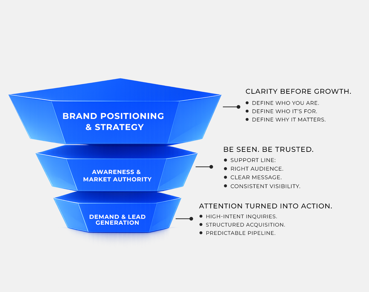 Each engagement focuses on building the strategic structure behind growth. Typical deliverables include - market positioning framework, messaging architecture, brand narrative development, go-to-market structure, credibility and authority systems, alignment between marketing, sales, and brand. The goal is to create a durable commercial foundation that supports long-term growth.